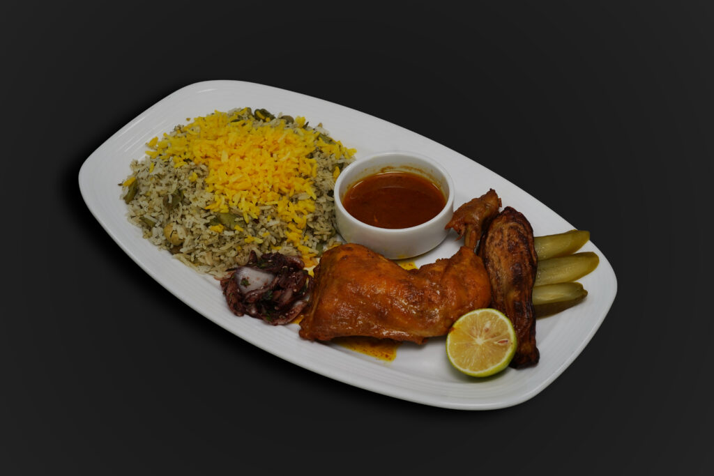 ران مرغ زعفرانی به همراه سس مرغ و بادمجان سرخ شده و پیاز به همراه یک پرس باقالی پلو ایرانی