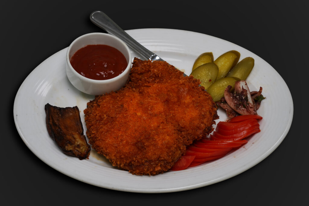 یک سینه مرغ ، پان‌کوت شده و سرخ‌شده تا طلایی و کرانچی، سرو شده همراه، خیارشور،گوجه و لیموی تازه.